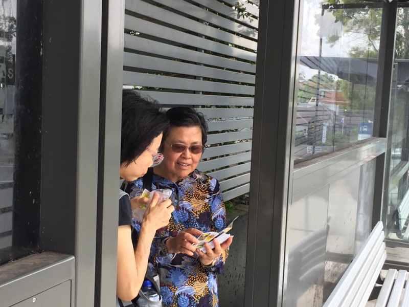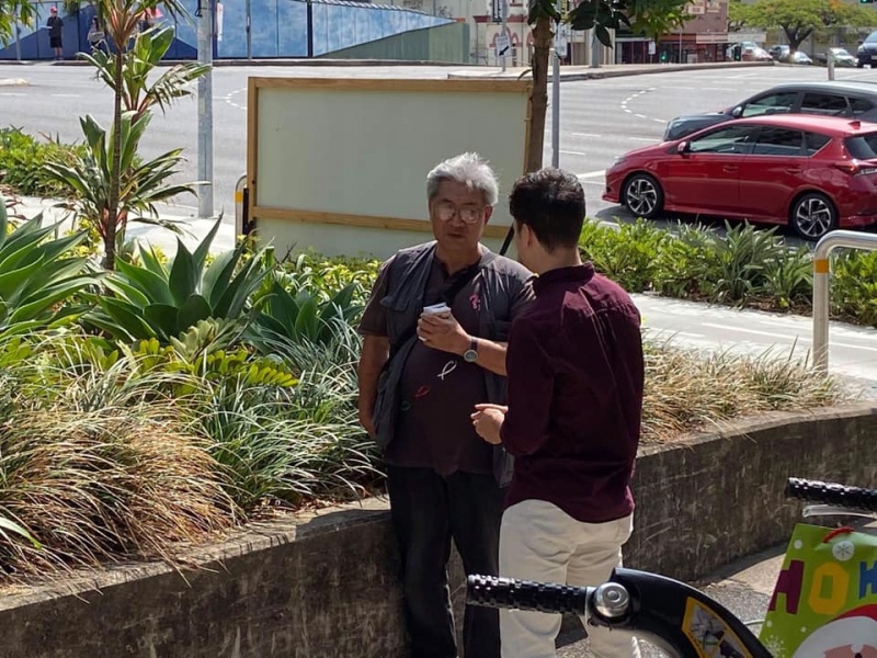 Praise the Lord, while Winnie our regular and committed member could not come today, God brought three new members to join us. Mrs Yuen Hang Tsui from BCCC, also a BCQ alumni same as Johnny and myself. The other two are the twin daughters of Pastor Lily Emmanuel and Deborah. With Col and Gary our two local Aussie regular team members, Johnny our captain decided to resume splitting into two group. He led Emanuel and Deborah to work at the main entrance to the Toowong Village with Lily joining them later to form a sub- team of four. Col, Gary , Mrs Tsui and Hung, we continued to work at the Banson Street from the foot of the footbridge to the traffic light and covering also the bus station.