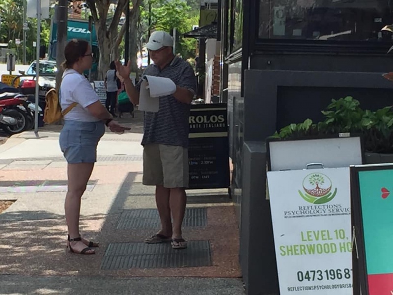 Meets 1:30-3pm every Tuesday afternoon at the Toowong train station on the 2nd floor and splits into two teams, one at the main entrance of Toowong Tower on Sherwood Road, another at the foot of the pedestrian bridge across Benson Street.