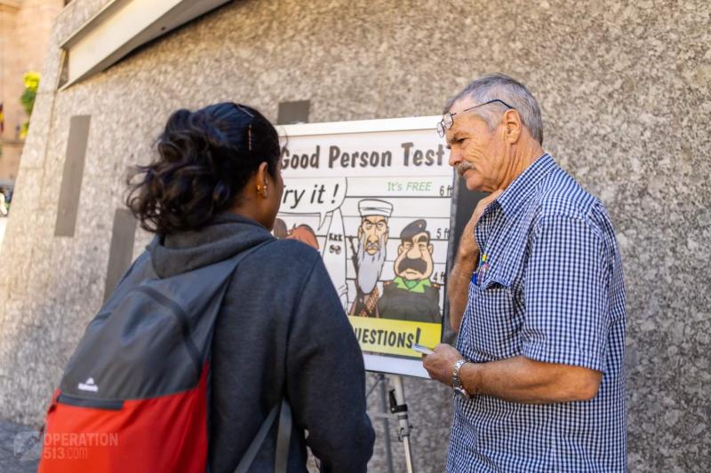 The JW man came up and approached the team seeing one of the messages that was displayed and was shown through the flip chart that like the rest of humanity he is guilty and deserving of God's judgement. He then sought to try and distract the conversation raising other different rabbit holes and getting away from the question posed to him, "How does someone get right before God?"