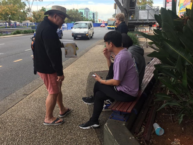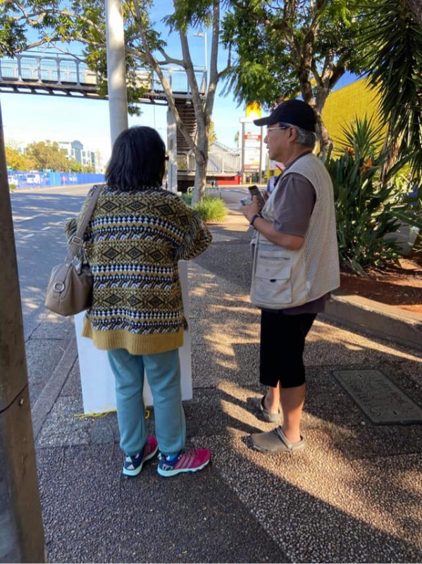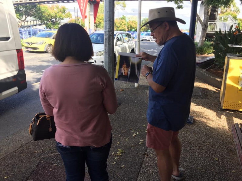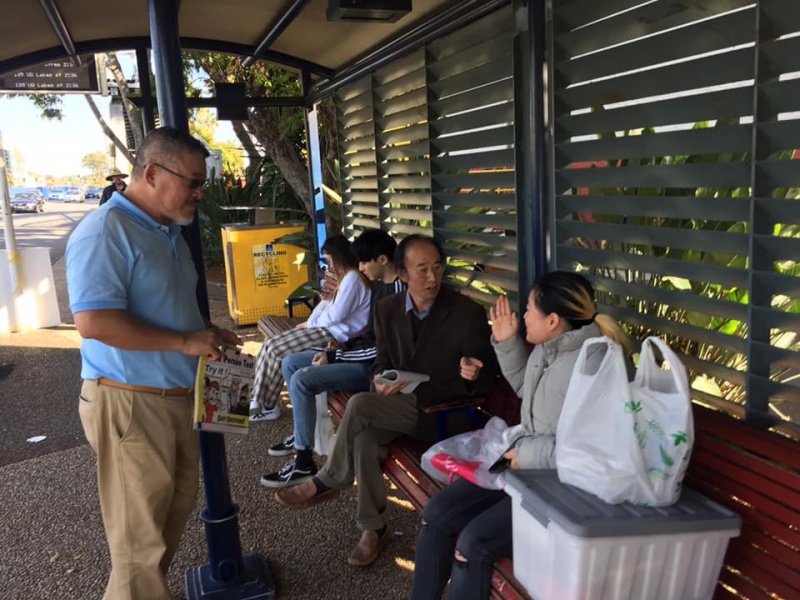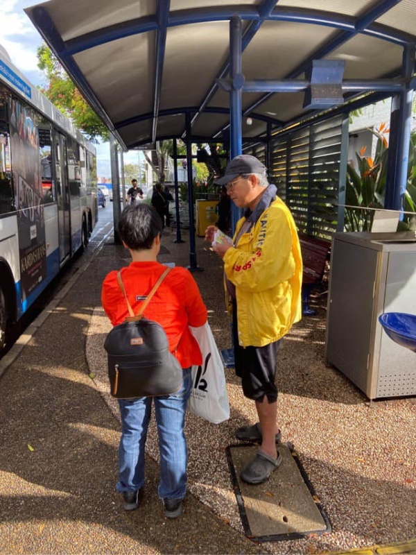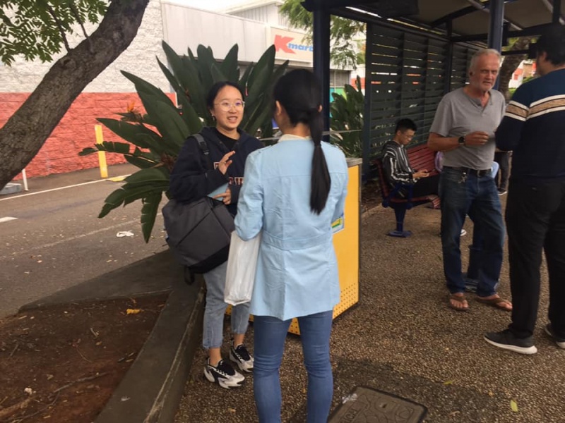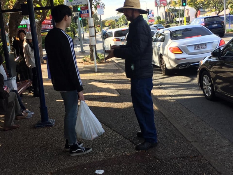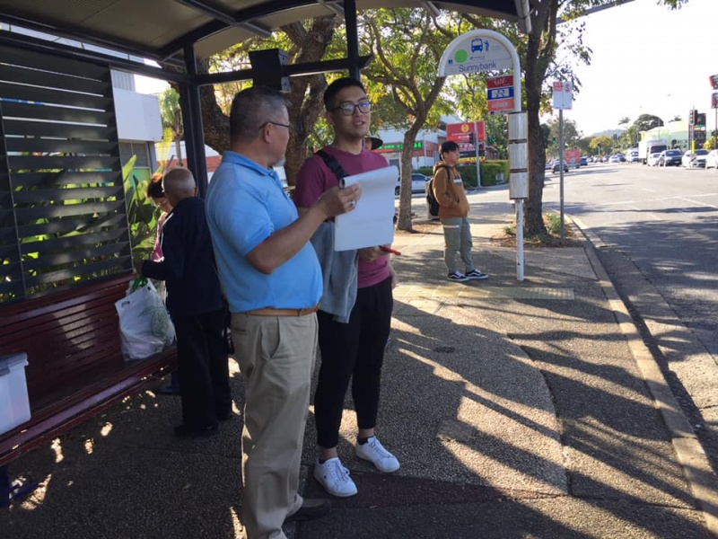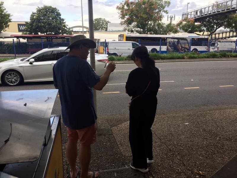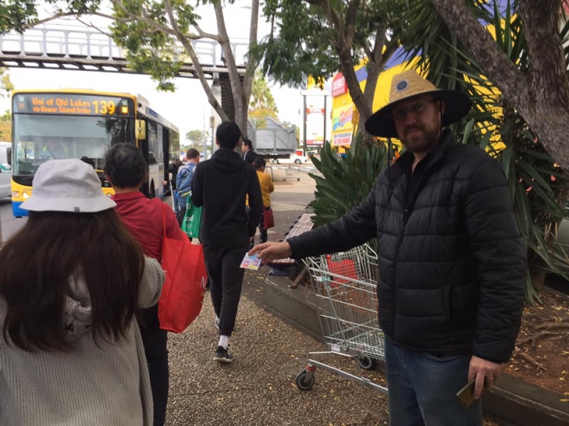 What a glorious day of Street Evangelism augmented by God. Our prayer for more gospel warriors has been answered so prominently today that a team of three from the Rock Church nearby i.e. Pastor Shu He David Zhang, wife Zhen Zhen, and member Linda turned up to day. Meantime, Hai Yue the graduate of the 6th Online Kairos also came for the 2nd time on her rest day of the busy rooster duty schedule of an Intern Doctor of the Royal Brisbane Hospital. So together with Gary, Johnny and Hung, God has raised up a big team of 7 persons to serve and partner with God. We spread out to two spots, one being the foot of the pedestrian bridge outside the Pharmacy Warehouse and the other at the bus stop. Actually, Haiyue who arrived a bit late served without boundary but all over the place as God led her to get hold of people between the aforementioned two spots.