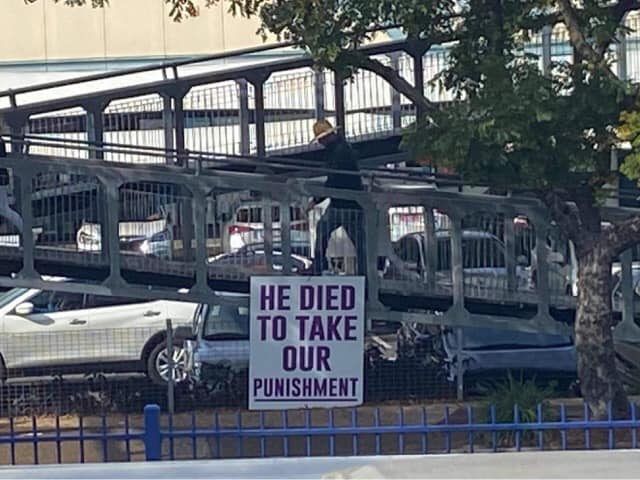 Today we started with 3 team members Johnny, Gary and Hung. Gary still stationed on the East side where he had set up two gospel signs. Gary came over to the West side to join us in opening prayer then returned to the East side. I went over to check him out and took several photos of him chatting with various people.