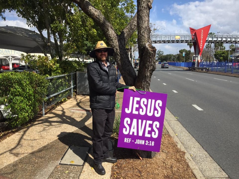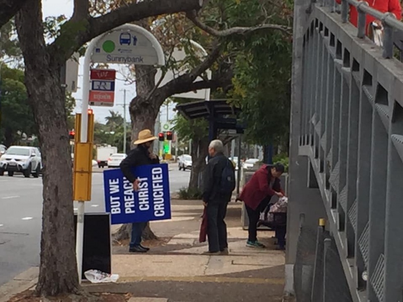 Praise and thanks God for calling Gary to join Johnny and Hung this afternoon at Sunnybank to witness for Christ. Gary made two big sign and showed it near the bus stop to both the passengers getting on and off the bus as well as attracting attention of the ongoing traffic. God definitely will use his such extraordinary acts to impress people that the message we share is utmost importance to their eternal wellbeing.
