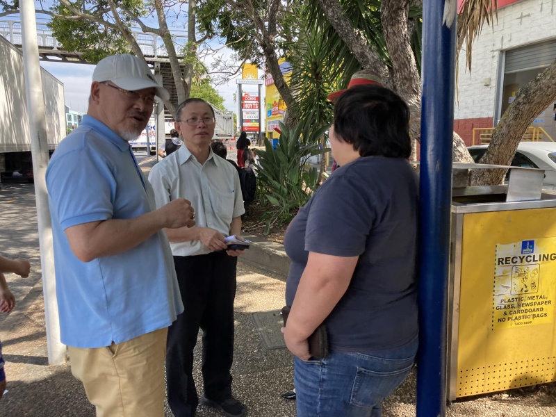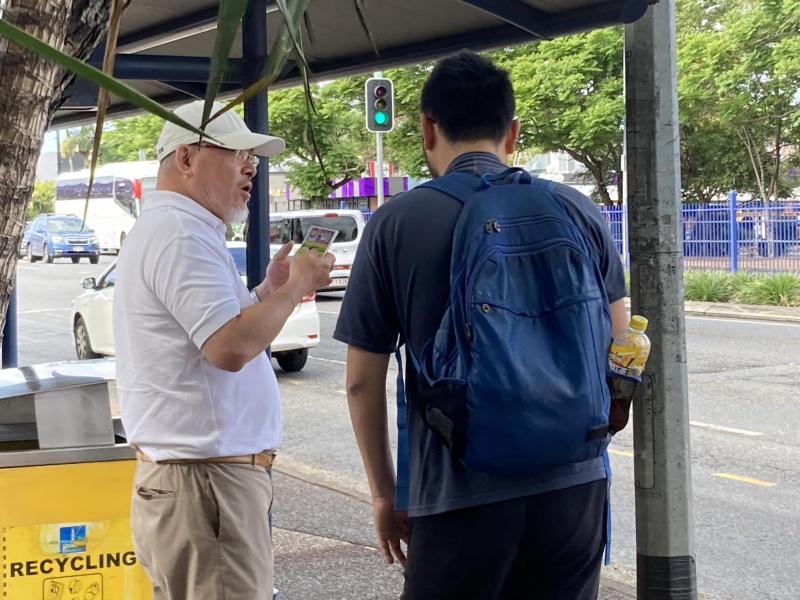 It was a dramatic day. I started the outreach work not firstly on the street at Sunnybank bus stop but God opening up a door for me to do mobilization work at SIC. First I noticed there are pile of Chinese Good Person tract in the office and the church office staff told me there are more stock in a box in the store room. It triggered a sharing and witnessing time with Fong Li the Muang minor tribe worker in the SIC office. Then I met Rev Samuel Suen outside the lobby eating his lunch. I was moved to invite him to do the rare Cantonese Kairos and hopeful learn to be a mobilizers of SIC Mandarin congregation. Let's pray for God's work to move Rev Suen to prioritize his time to do this 16th online Cantonese Kairos.