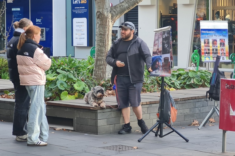 In March, I was doing some online evangelism training with Fran. She lives in NZ too, and she just so happened to be coming down to the city I live at the beginning of April, and so we organised for her to join a street outreach. On Friday the 4th, she joined Roger and I on a sunny afternoon outreach on Cashel Mall. We had a great time having gospel conversations and giving away tracts. Roger had his flipchart going, and Fran was able to see how it worked.