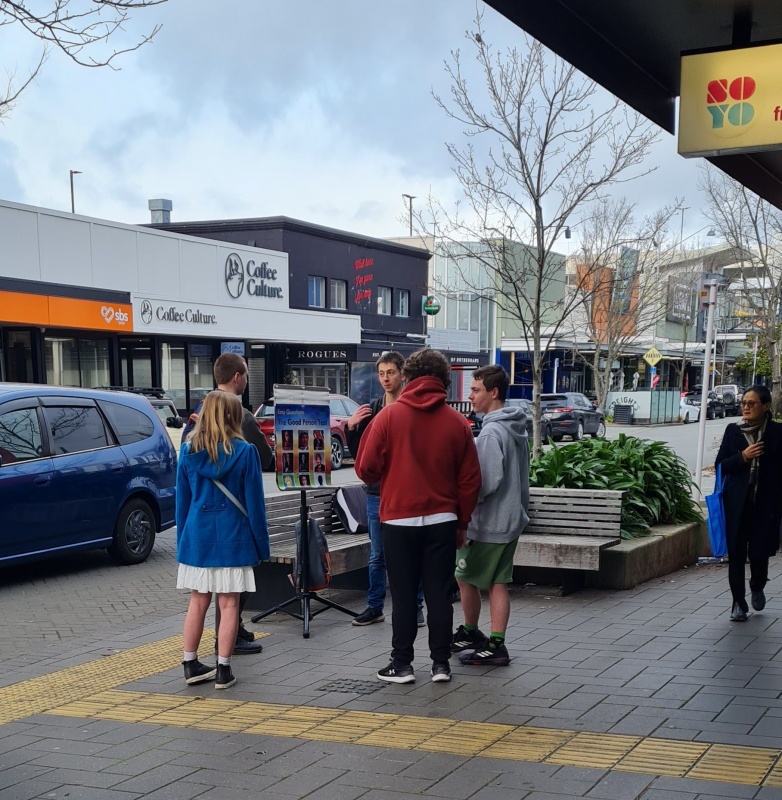 On Saturday, I was very encouraged to have Toby join me again. He’s a member of the same local church as me. We were at the corner of Riccarton and Rotherham. I set up my flip chart, and we had a very very busy 2 hour outreach. The highlight was being able to talk to multiple groups of school aged kids, including one group down from Nelson for the weekend. Also, it was so good seeing Toby getting involved and giving it a go!
