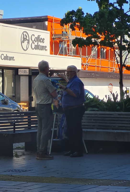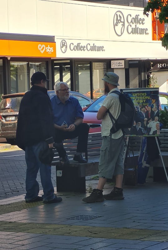 On the Friday just been, there was a spring-like feel in the air. Nice sun, but a gusty wind. Roger didn’t set up his flip chart, but Brian and Laura did. There were heaps of school kids out fundraising for something, and I noticed many of them were having gospel chats with our team as well! (as per the pics)