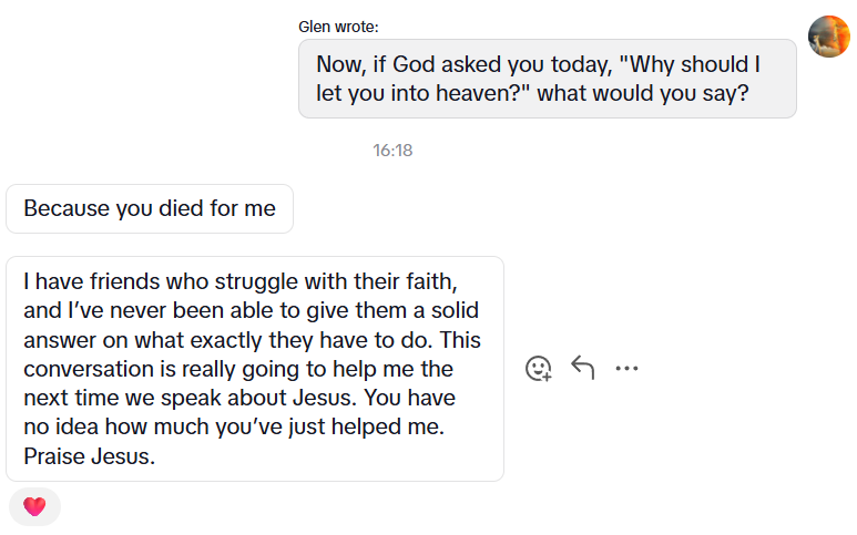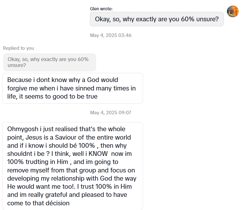 I can speak in tongues! It’s true! See the pictures for proof. One of them you will see a snap shot of a TikTok direct message conversation in Arabic. I don’t know Arabic, and yet I was still able to communicate the gospel (or at least start a gospel conversation). All this, thanks to modern translation software. It’s so great. Whoever it was said, “there are no Christians around me, and I have many questions”. I responded with, “Sure, what’s your first question? Also, why can you go to heaven when you die”. And we went from there.
