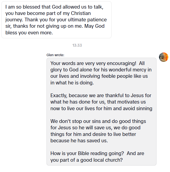 I’ve also included 2 screenshots from a text chat I was having with someone. It was super encouraging to me what they wrote, I hope it will encourage you too. God is truly working on the hearts of people through the feeble efforts of his saints.