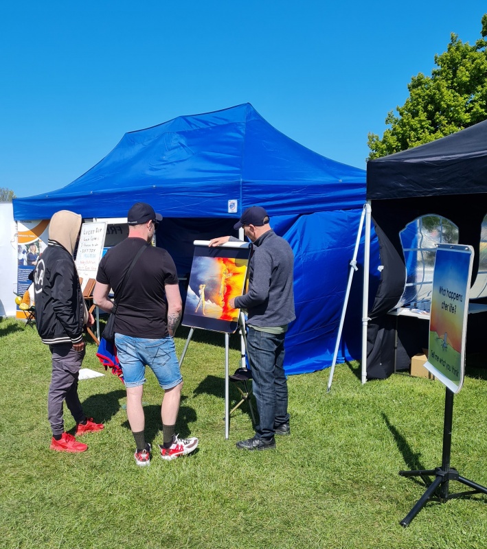 Andy and I were there by 7:30 am to set up our site.  It’s the smallest site we have ever had!  Normally we have enough room to set up 3 flip charts, but there was only enough room for 2.  We set up a gazebo, laid out a table of tracts and bibles, set up the flip charts, and slapped on some sunscreen.  A nice sunny day, but there was a cold wind, so I still wore my puffer jacket for most of it! :)  The site was ready by about 10 past 8.  Ollie had arrived, and so the 3 of us started the outreach with some prayer.  But, even as we were praying, our first 2 customers approached a flip chart!  I peeled off to engage them, and the long, busy day of gospel outreach was underway.
