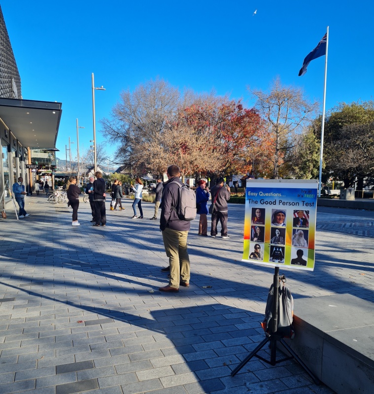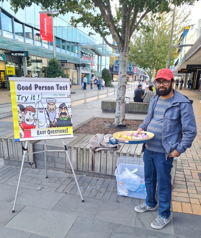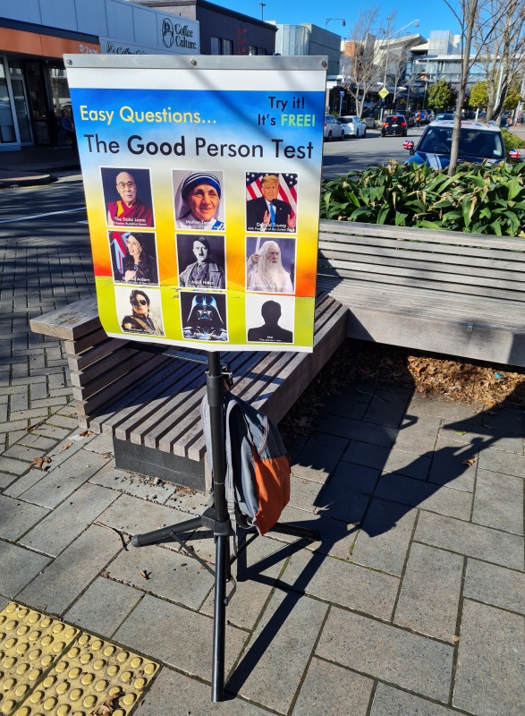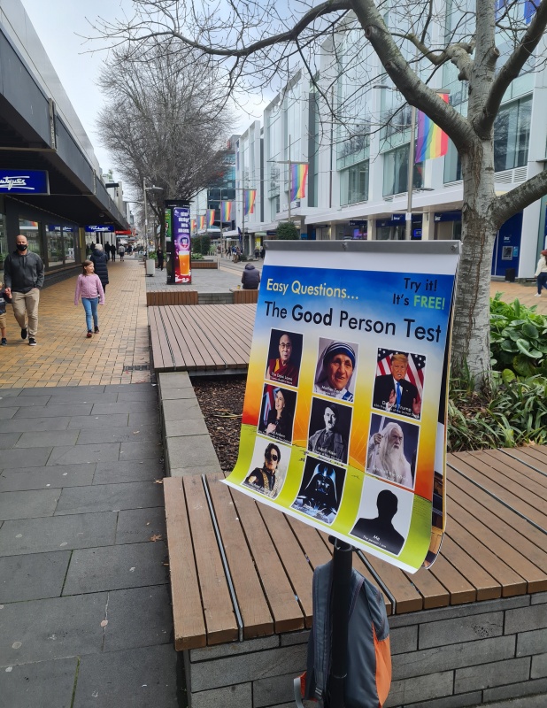 Saturday’s outreach was amazing! The sun was out and melted the frost. It was so good having Mitzi join me again in Riccarton. I had the “good person test” flipchart up, and it attracted a lot of attention.