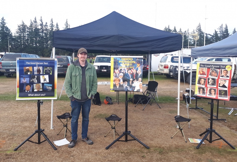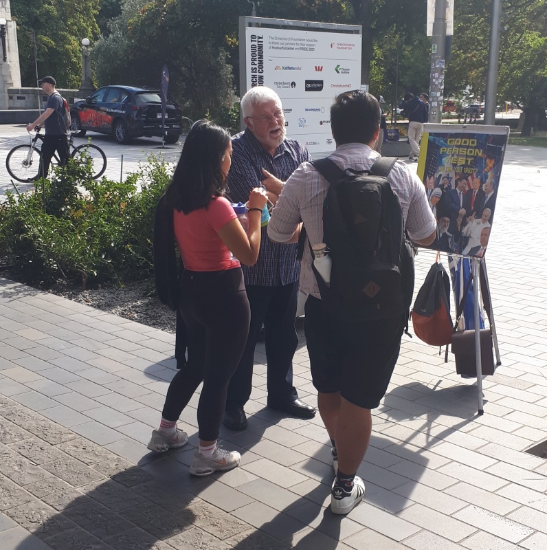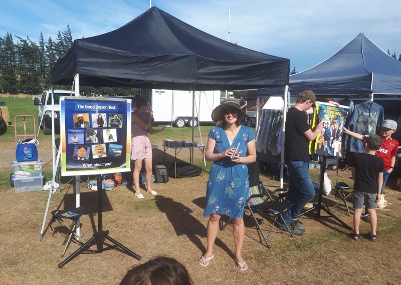 A team of four.  I had my flip chat, and my first chat was with a guy who just walked up and was intrigued by the “good person test” - we fell into an easy conversation.  But sadly he was about to go to the airport to catch a plane home to Invercargill.  I was able to touch on the law and the gospel with him, and he took a tract to read on the plane.