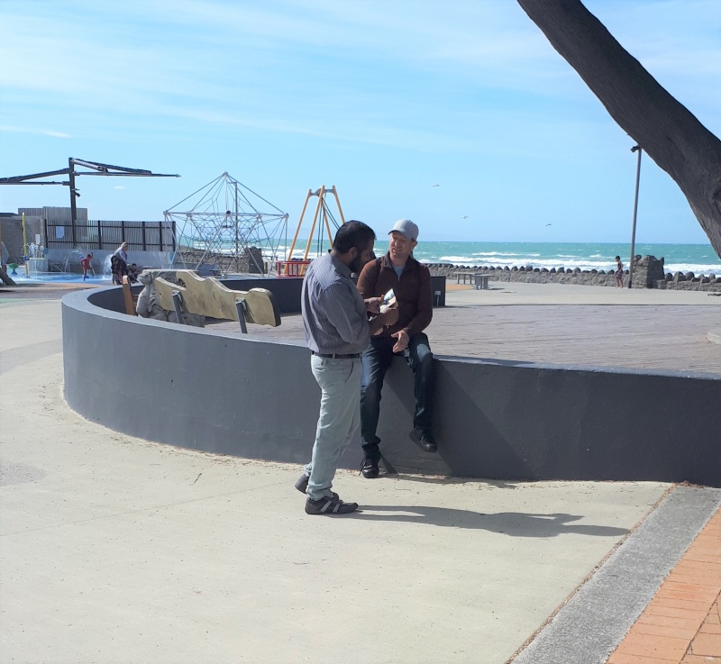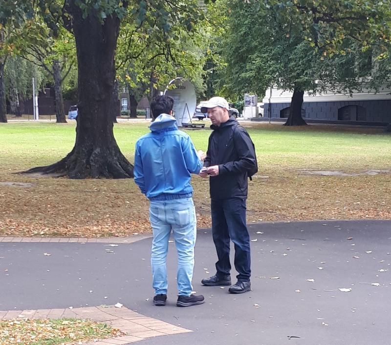 Damien is a Christian who joined us yesterday for lunch, and today he was able to make it for the first half hour or so of the outreach - he was keen to go through the flip chart.  As I was showing it to him, a fish swam past.  I cast my line by asking if he had a minute for a question - a deep one.  He was keen, and so I invited him to try the good person test - a great opportunity for Damien to see it in action!  And it sure was.  The young man was a student from Syria and a Muslim.  We went through the law and the gospel.  He understood it very quickly, but then started gently resisting it.  I had already worked through all the ways people think they can be forgiven, but won’t actually work: good outweighing bad, saying sorry, prayer.  So in his resistance, he tried to raise these reasons and quickly realised he was backed into a corner with the only escape being Jesus.  He softened and said he is currently researching these things.  So I pointed him to the Bible and to Cornerstone International Bible Church (which Damien is a part of) - he seemed very keen.  It was a great chat.