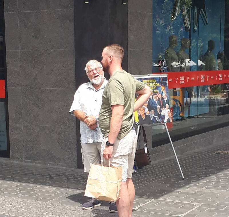 On Sunday afternoon, after church meeting, I headed into Cashel Mall for some street outreach. It was great to have Mike join me! I had three solid chats.