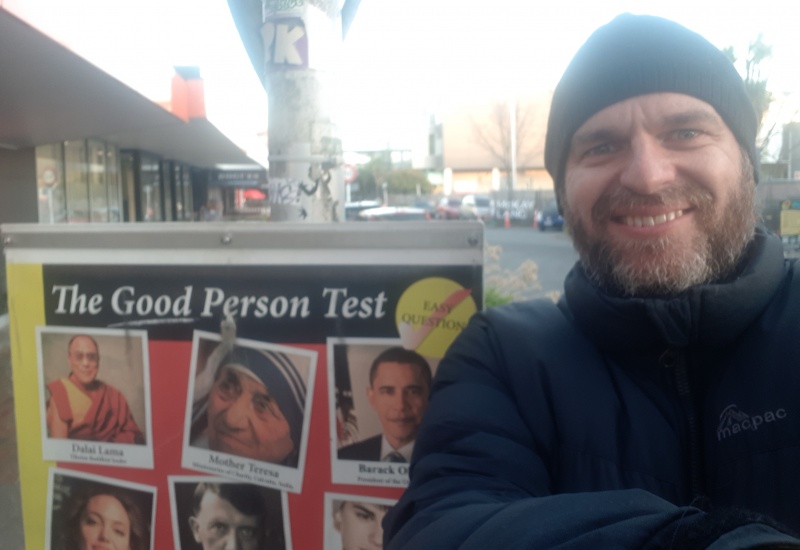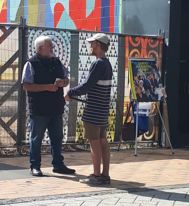 I then had a string of conversations with Christians.  Firstly with a young man (and his girlfriend) who I had taught in Sunday school when he was a little kid!  It was great to catch up; then I had a youth pastor from Queenstown go past, and we fell into an easy conversation; before a Christian family wanted to check out the good person test flip chart.