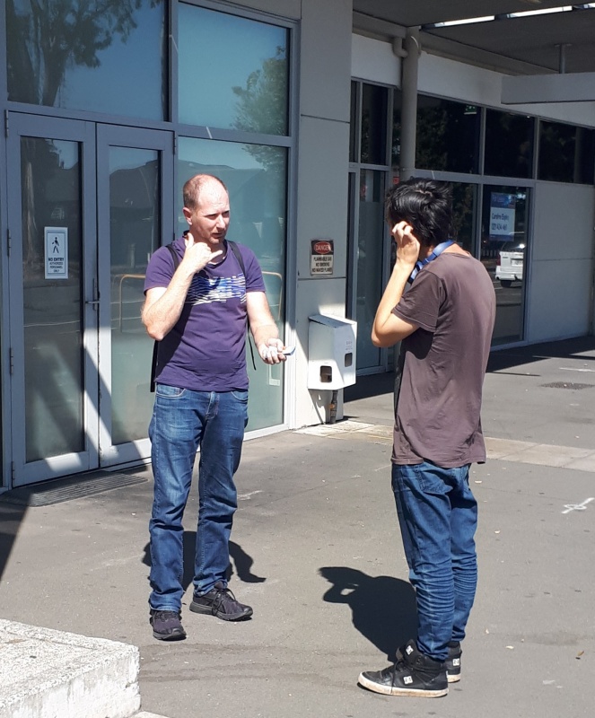 Our conversations ended at different times, and so Andy and I became separated, but we ended up meeting again outside Ara.  Andy had a great chat there with two high school students (pictured).