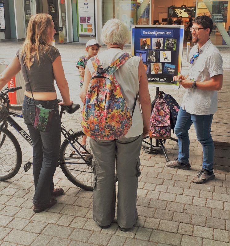 The outreach started with a conversation with three young high school students enjoying their summer break. They were keen to give the flip chart a go. Two of them became resistant, and so some apologetics were deployed. But the other guy was interested, and arguing on my side. Eventually, I said, “Look, I have some good news to share, do you want to hear it? Because your friend does.” They disengaged, and left their friend to me, where I was able to slowly but surely explain the gospel - it was wonderful seeing him come to an understanding and saying that there was nothing stopping him from trusting Christ’s payment for his sin. I challenged to do so, and asked him to get in touch.
