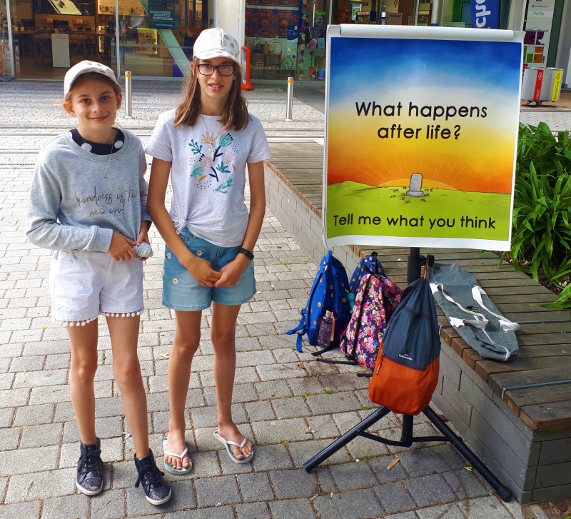 I know this report is getting long, but after a rest on Saturday, I was feeling really fresh for the Sunday afternoon outreach in Cashel Mall - the weather was hot. A team of six were out - including my three daughters.