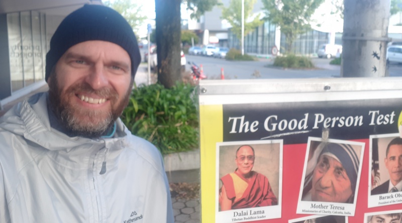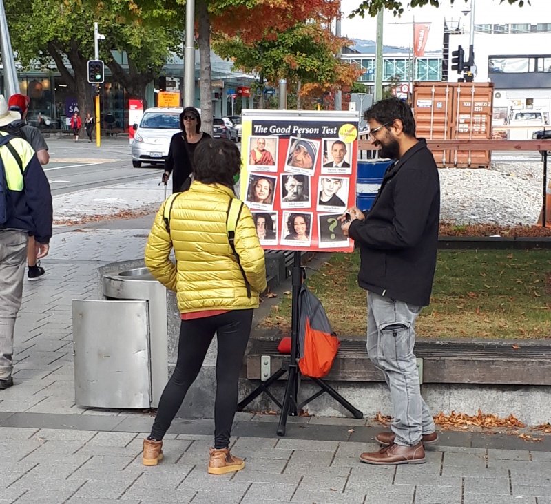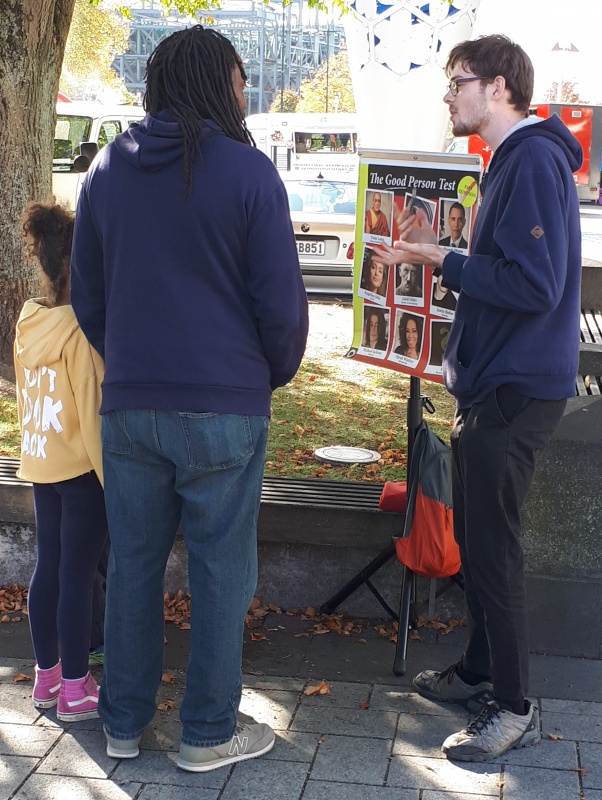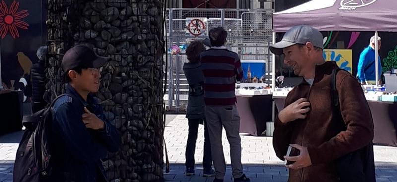 Andy’s first conversation in Cathedral Square was with a young man from China (pictured).  This man was extremely engaged with the information he was learning about Jesus Christ, so much so that he accepted an invitation to join the Barlow family for dinner on Saturday night and to continue the conversation!  Praise God.