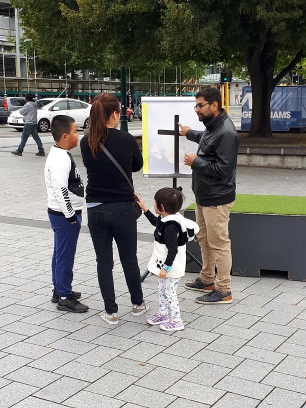 A team of 5 from 4 different churches in the afternoon in Cashel Mall. (And there were at least 2 from OAC sharing in Cathedral Square.)