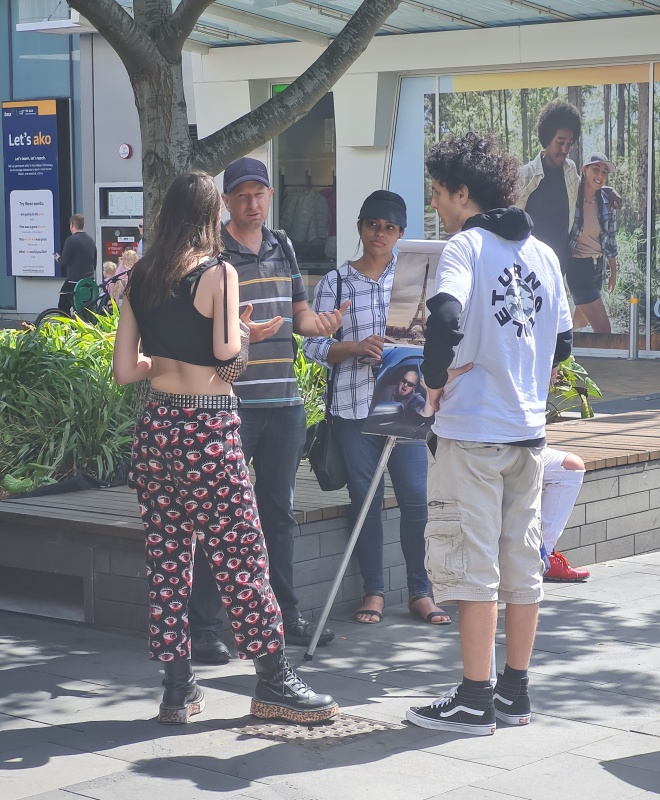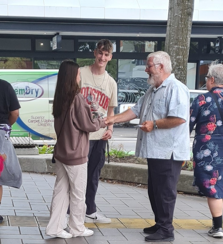 It was during this conversation that I became aware of a guy throwing something large at the glass doors of the BNZ bank! I called the Police and stayed around until he was arrested. So sad. Earlier in the outreach, he went past me and even accepted a tract. I hope he reads it while in custody.