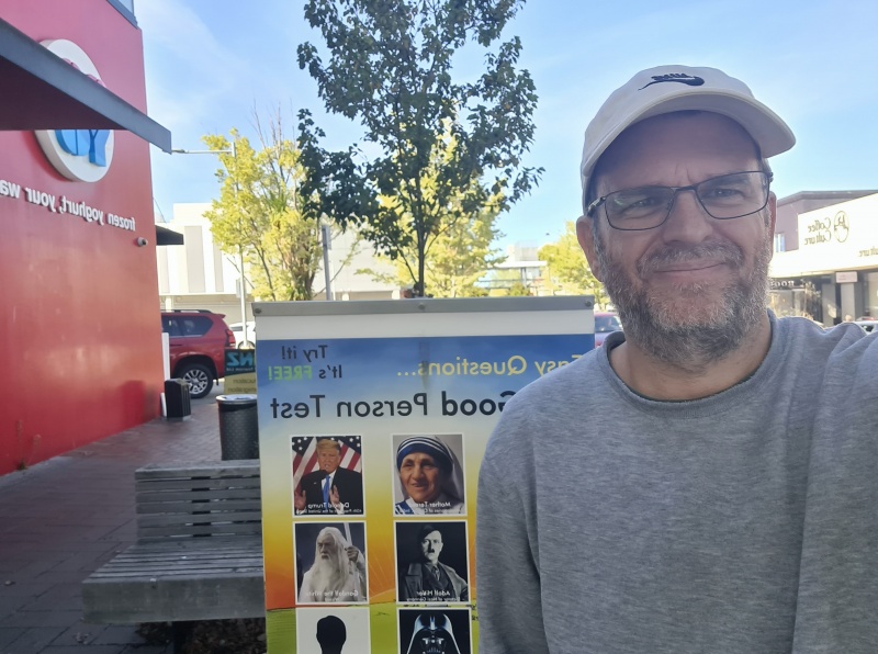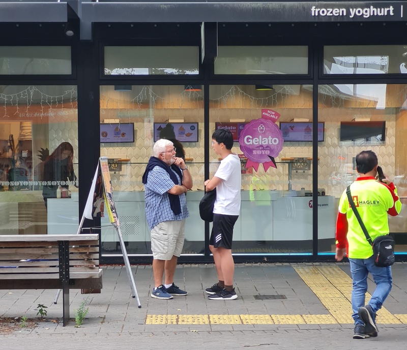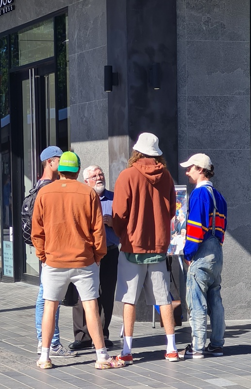 It’s the end of another awesome week of gospel outreach. Another week of God’s patience. A standard week this week, although I stayed online on Friday due to rain. I’ll work backwards in my report, starting with today’s (Sunday) outreach in Cashel Mall.