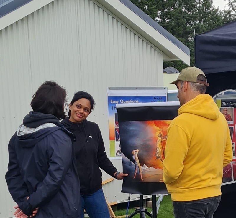 The chat ended with the lady becoming offended. I challenged her to change her mind about her worldview. That was offensive to her, “you don’t challenge people like that”. The man smiled, he understood that I was coming from a place of love and concern. I changed the word to ‘plead’. “I’m pleading with you: the issue of the afterlife is too important”. One of the pictures shows Dani talking with this couple.