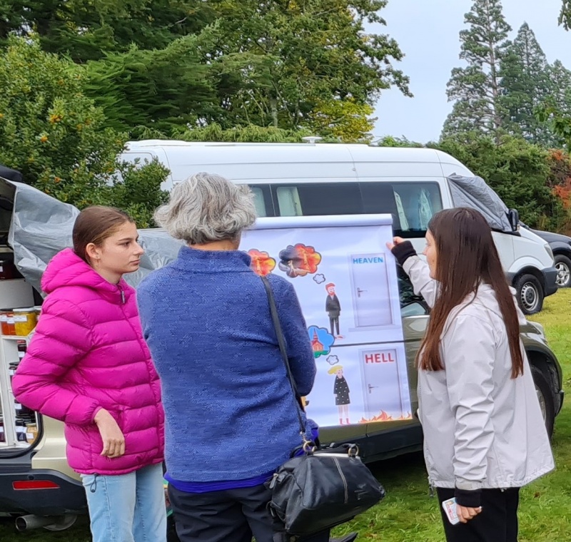 A lady went past and she said, “Are you Mormon?” No. “JW?” No. “Oh” she says, “then what are you?”. We fell into a good conversation. But it was a difficult one, because I had to be gentle in trying to untie some of the really bad theology she was holding on to. It was an extreme form of pentecostalism / charasmania. Where she believed God was giving her and her husband visions that clearly contradicted scripture. And, unfortunately, this was impacting her soteriology in a subtle way: she was trusting in her ability to deal with generational sin and ask for forgiveness. She talked about having “enough” faith for salvation: that’s works in disguise! Anyway, her husband had had visions of a military build up in NZ, and that there would be some kind of coup and all Christians would be rounded up and killed. And so her husband was preparing to flee to the bush. I was able to gently work with her to the point where she understood that these “visions” might not be from God. But unfortunately, I wasn’t able to make much progress in working on her soteriology. There were other issues as well, and I would have loved to have more time with her.