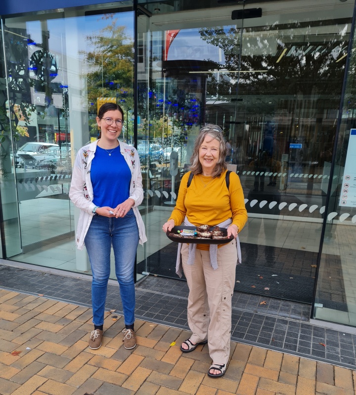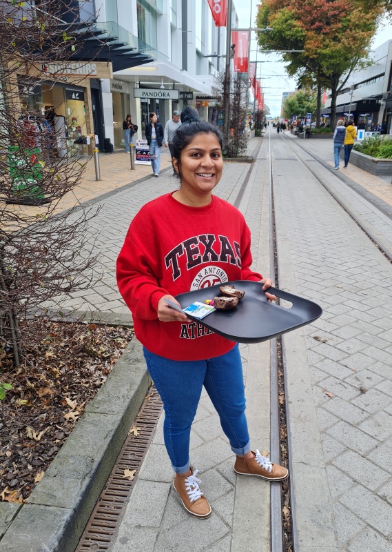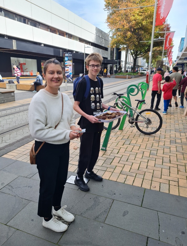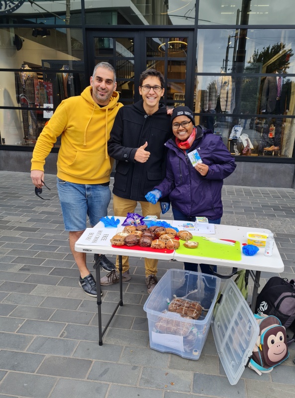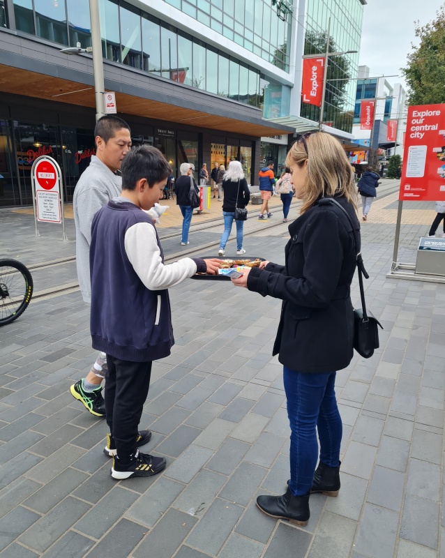 During the outreach on Saturday we gave away 500 buttered hot cross bun halves. We had 3 buttering stations down Cashel Mall, and trays were loaded up and taken by Christians to offer to those going past. Also, flipcharts were up and many gospel conversations were had. I’ll let the pictures do the talking! From my perspective it went really well.
