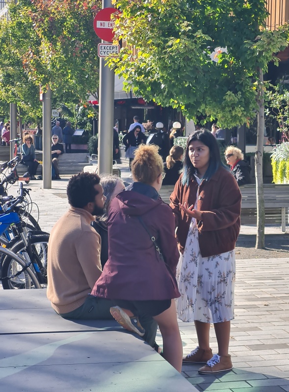 The outreach went long when Tanush and I had a good conversation with a young couple. And David was having a separate chat beside us (he took over my flip chart, haha). Such a good outreach!