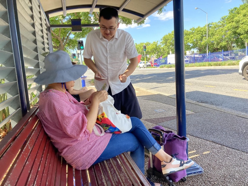 Despite of the week-long heat wave alert, God gave us a window of overcast but dry weather with cool temperature best for street outreach. Praised the Lord Winnie was able to rejoin the Toowong team today though with unpredictable delay due to stomach pain. So, I started solo first and Winnie rejoined me about 20 minutes later. Both had great outreach opportunities leading to many fruitful gospel sharing conversations. Recap below is the Battle of Hung. (**By the way, I have to take next Tuesday off as I need to accompany my wife for a specialist consultation appointment to determine if a spinal bond operation is needed to enlarge the shrink spinal cord tube)
