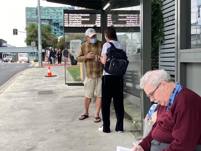 Today was a very warm and sunny Winter afternoon. As usual Johnny Winnie and Hung teamed up to reach out to mainly UQ students at the Bus stop. For consecutive weeks, there are a long queue at the Bus stop around 1340. It was not good for outreach as people tend not like to get into conversation with a stranger in the public with people in the queue all on watch. But we still managed to approach people moved by the Spirit. After the queue was clear, we resumed back to more one on one conversation with generally good results. Recap below is the Battle Log of Rev Hung Kwan.