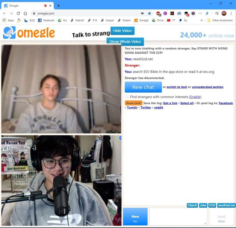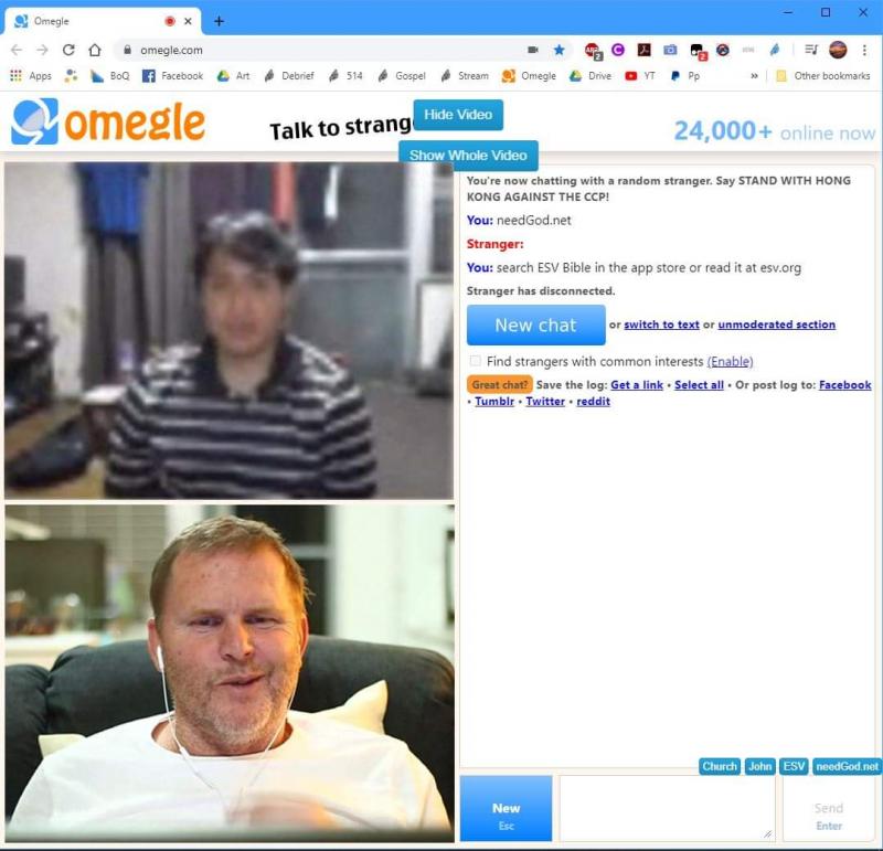 Monday on Omegle was another double outreach. It was exciting to see people from all over the world come to hear the good news about how a sinner who deserves Hell can be made right before God and end up in Heaven!