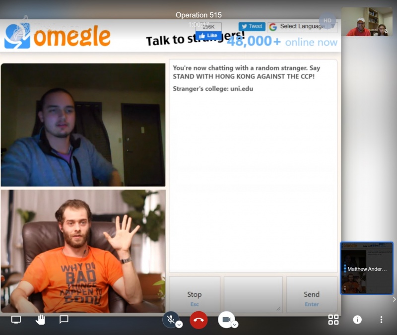 “It's really thrilling to read your accounts of the gospel going out. I have been praying for you guys. Keep up the great work. I've been doing some Omegle text chats. Can't quite get myself to plunge into a video chat yet!”