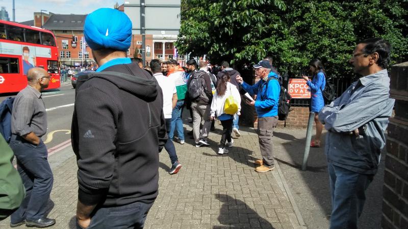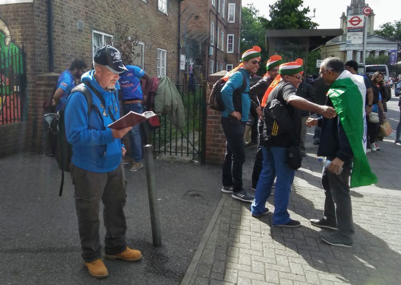 Posted 10 June 2019, 3:43 AM by Chuck Bosio. PermalinkOperation 513 joined up with Sports Fan Outreach to hand out tracts, have conversations and preach to the crowds going to the International Cricket match between India and Australia this morning at The Oval in London. A young man from Portugal named Ruben was a bit inebriated, but he kept asking us questions for quite a while. I took a picture with Ruben talking with Bill Shank. Bill was with me for SFOI and he began by singing "The Old Rugged Cross" and preaching to the crowds going to the game. One fellow pointed to the Oval and said, "That is my church". I took over the preaching chores as the crowds peaked leading to game time. I used Mark 10:45 again to summarize the Gospel. I asked "How do you define greatness?" Jesus defines greatness as being the servant of all. Not only that, he came in to this world to give his life as a ransom for many. Since Karma means debt, I said that Jesus came to pay the debt, your Karma, so that you don't have to pay it. (That turned a few heads, Bill told me.) I saw very few Australia fans, but many Indian fans. I was handing out a tract by Voddie Baucham about "Life's Ultimate Questions", since so many Indians are practicing atheists. Kuldeep took such a tract and promised to read it at home. I handed out two NT's. I gave one to Ian, but the first fellow's name escapes me.