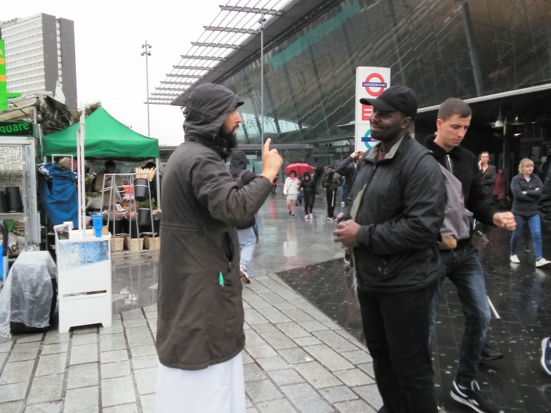Jacob spoke with Marius from Roumania, whose father passed away recently and Alicia, a young woman who was very depressed. I wound up giving out all my tracts this time to James from Barking, Mary from London and Steve, They are all involved in outreach in London. I started preaching for a marathon +90 minutes. I felt lead to emphasize Christ's humility in His birth, His life and His death. False religion always exalts itself, but true religion is a call to humility, repentance, self-denial and faith. Curiously, some Black Hebrew Israelites sat down near me and a loud conversation ensued with Aaron, a Christian who argued with them for ages.