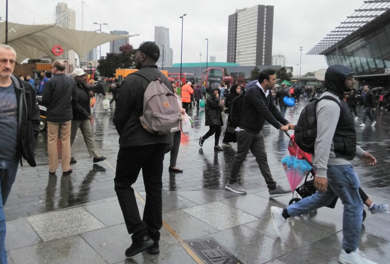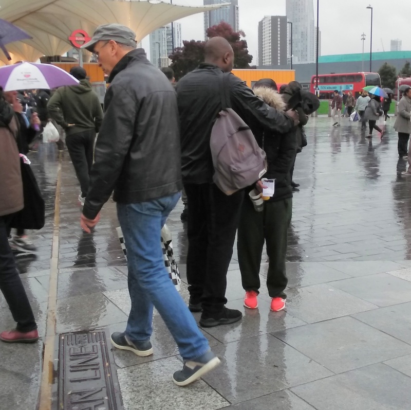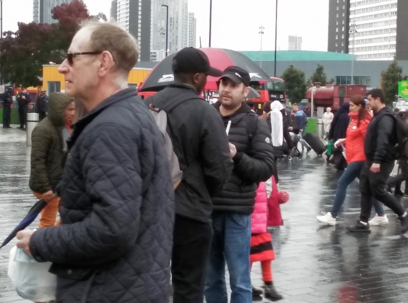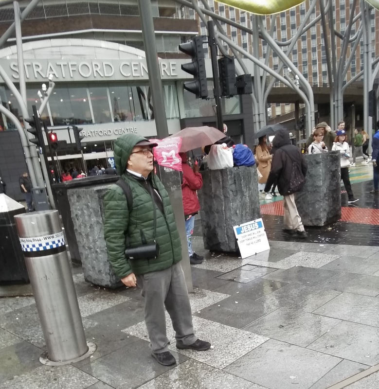 Operation 513 was in Stratford today. Jacob Moswa and I joined three members of the Sports Fan Outreach International in the rain. The SFOI guys took a break after four hours in the rain and I continued to preach and Jacob spoke to a number of people. Jacob and I both engaged with Samir, the Muslim outreach man. We didn't get very far with Samir, unfortunately, as he always badgers us to show where Jesus said that He is God. I mentioned John 8:24 and the 'ego eimi' statement of Jesus, but Samir wasn't accepting that. He asked Allah to make note that I was a liar, but we didn't get any further. Jacob showed Samir John 20:28 where Thomas says, "Ho Kyrious mou kai ho Theus mou", but that didn't impress him either.