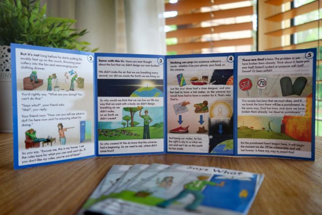 This tract begins with a short story that leads into a question of "who has the right to say what we can and can't do in our lives?". It answers this through a quick apologetic of how we know there is a God and establishes that He is the one who has the right to make laws over us.